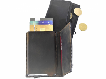 Mala moška usnjena denarnica dimenzije 7,5 x10,5 x 2 cm ima vstavljen aluminijast etuij za 6 kartic, kateri ščiti kartice pred poškodbo in hkrati ima RFID zaščito, katera ščiti proti kraji denarja iz brezstičnih kartic.Kartice s pomočjo posebnega patentiranega mehanizma pridejo same ven iz etuija, tako, da gumb na spodnji strani etuija podrsate proti sredini.Poleg tega v dodatni žep lahko shranite še 6 kartic. Denarnica ima tudi predal za papirnat denar in na zadnji strani žep na zadrgo za drobiž.Narejena je iz kvalitetnega usnja,ki je zelo trpežno.