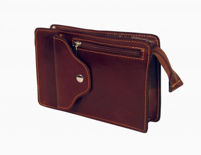 Moška ročna torbica. Primerna za hranjenje dokumentov ter drugih drobnarij. Notranjost - 1 lepo dodelan predal, hrbtni predalček z zadrgo; Zunanjost - Vidnen žepek in predal z zadrgo, hrbtni predal z zadrgo. Dodan pašček za čez roko.