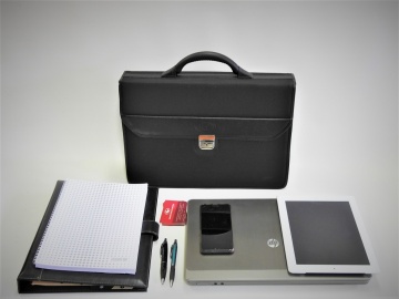 Poslovna aktovka. Notranjost - 2 lepo dodelana predala + sredinski predal z zadrgo, prostor za mobilni telefon in kartice; + pas za čez ramo.